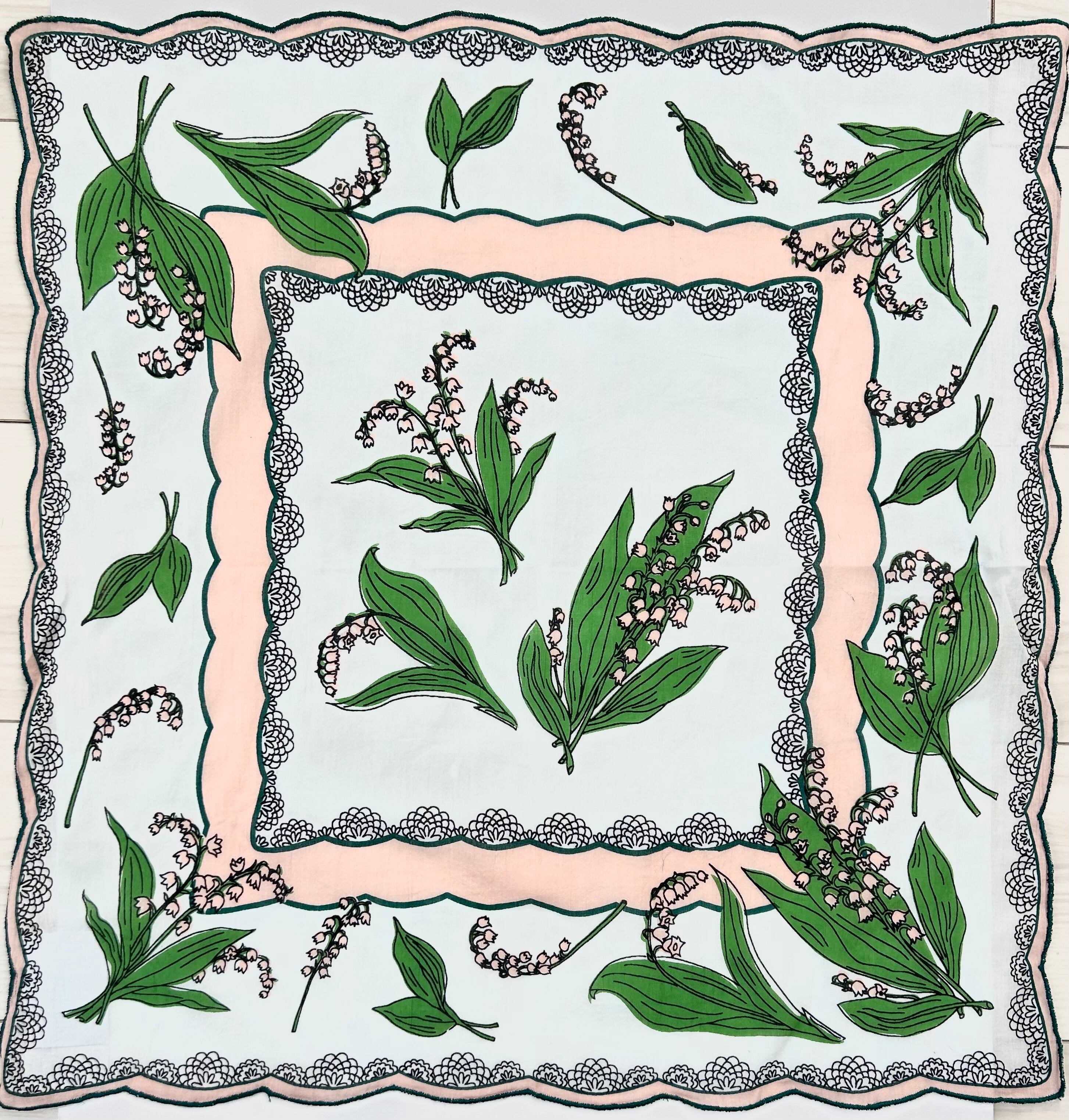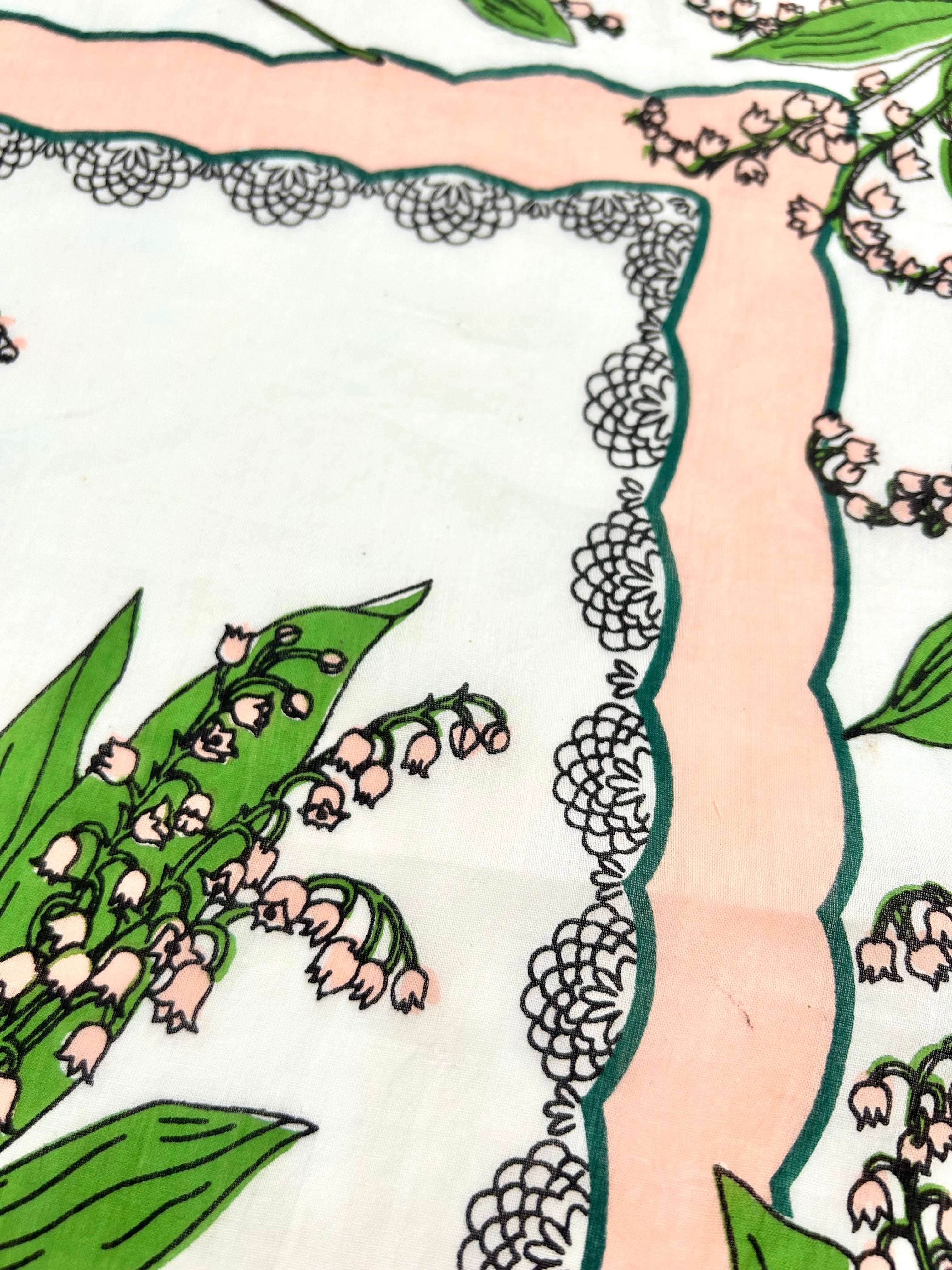 淡い優しい色味のスズラン柄が可愛いハンカチ。薄手のコットンで、フチは糸でフリルのようなデザインになっています。