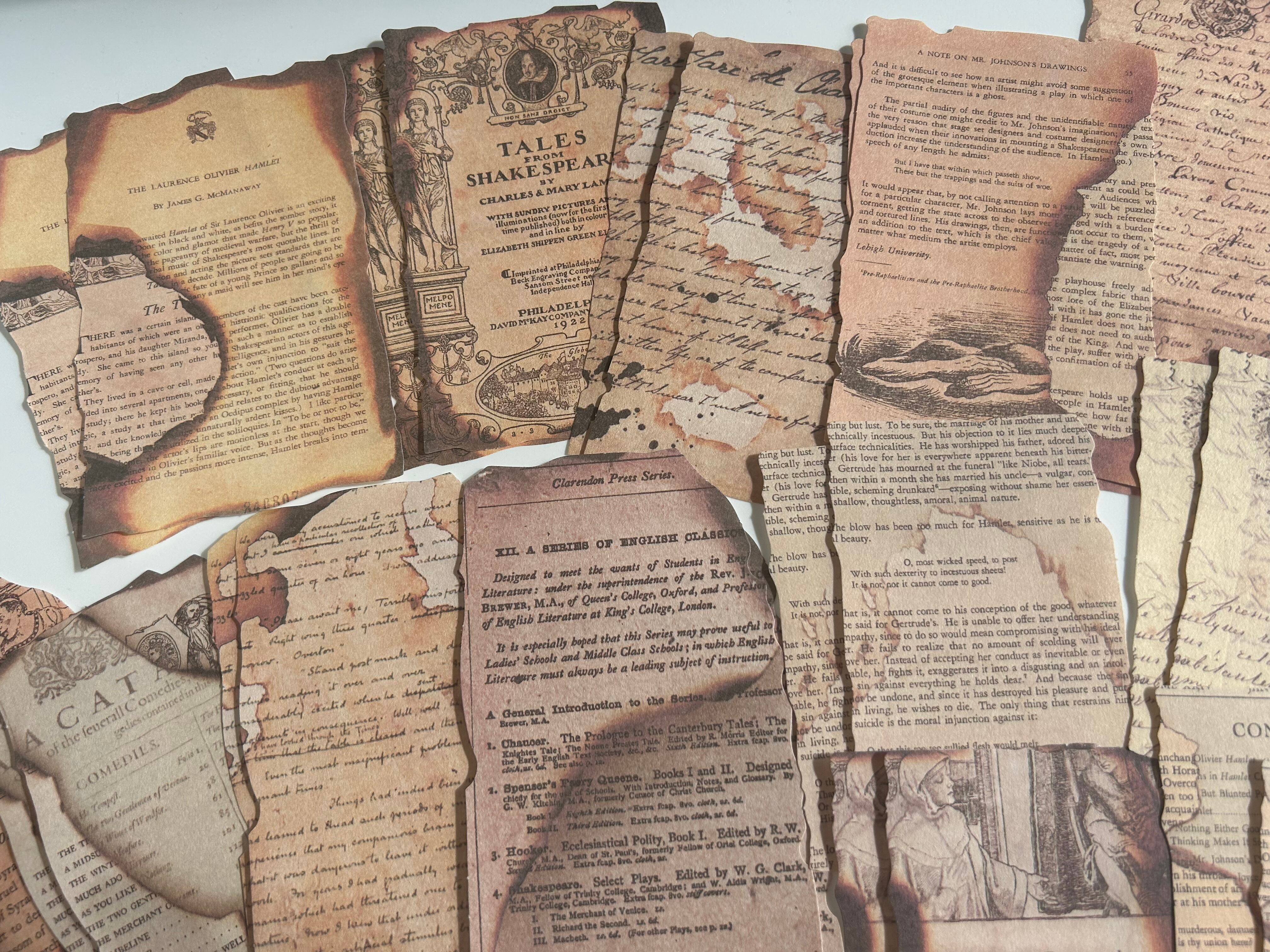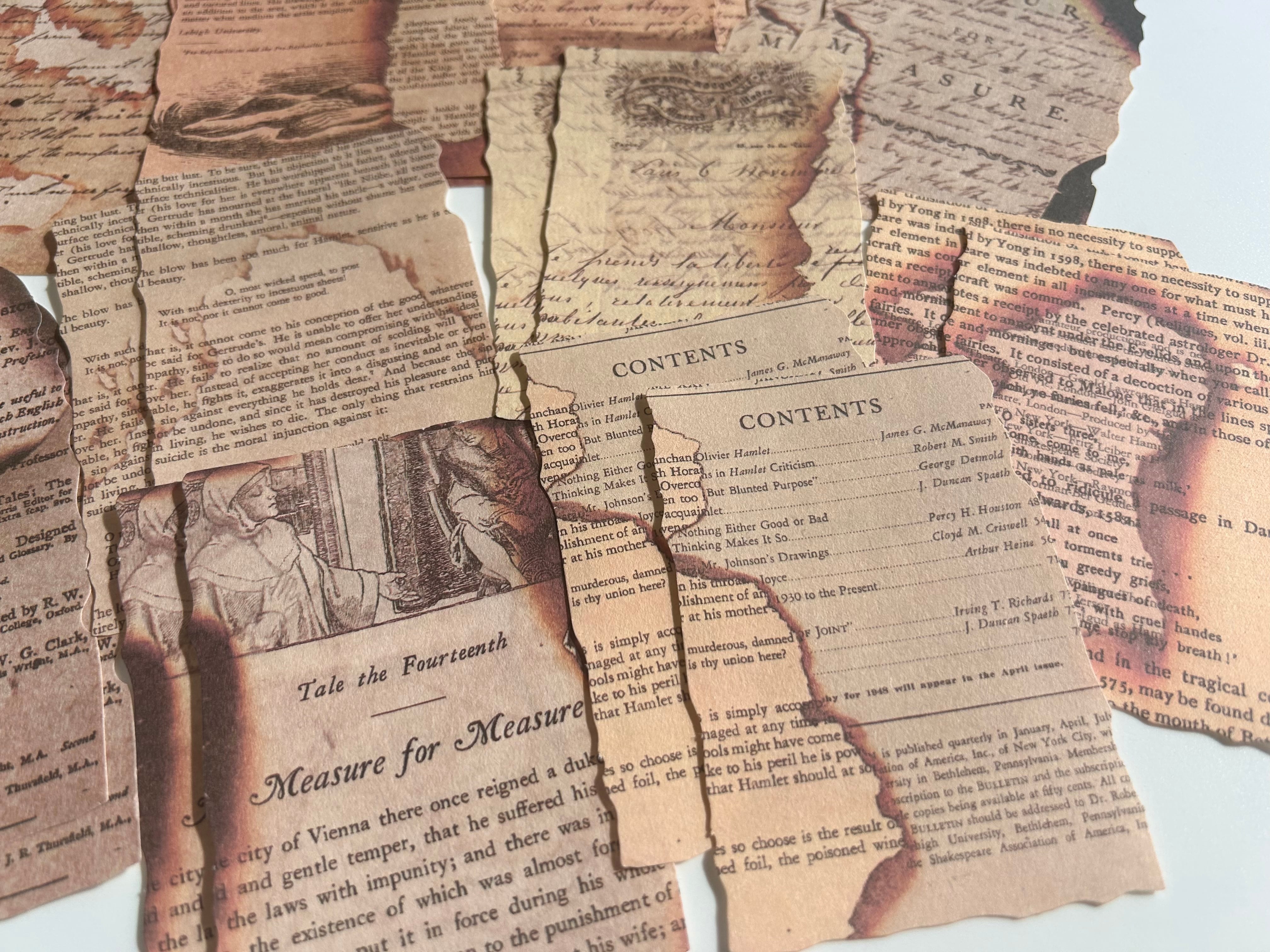 アンティークの本をちぎって焦げさせたように加工されたデザインの紙セットです。
