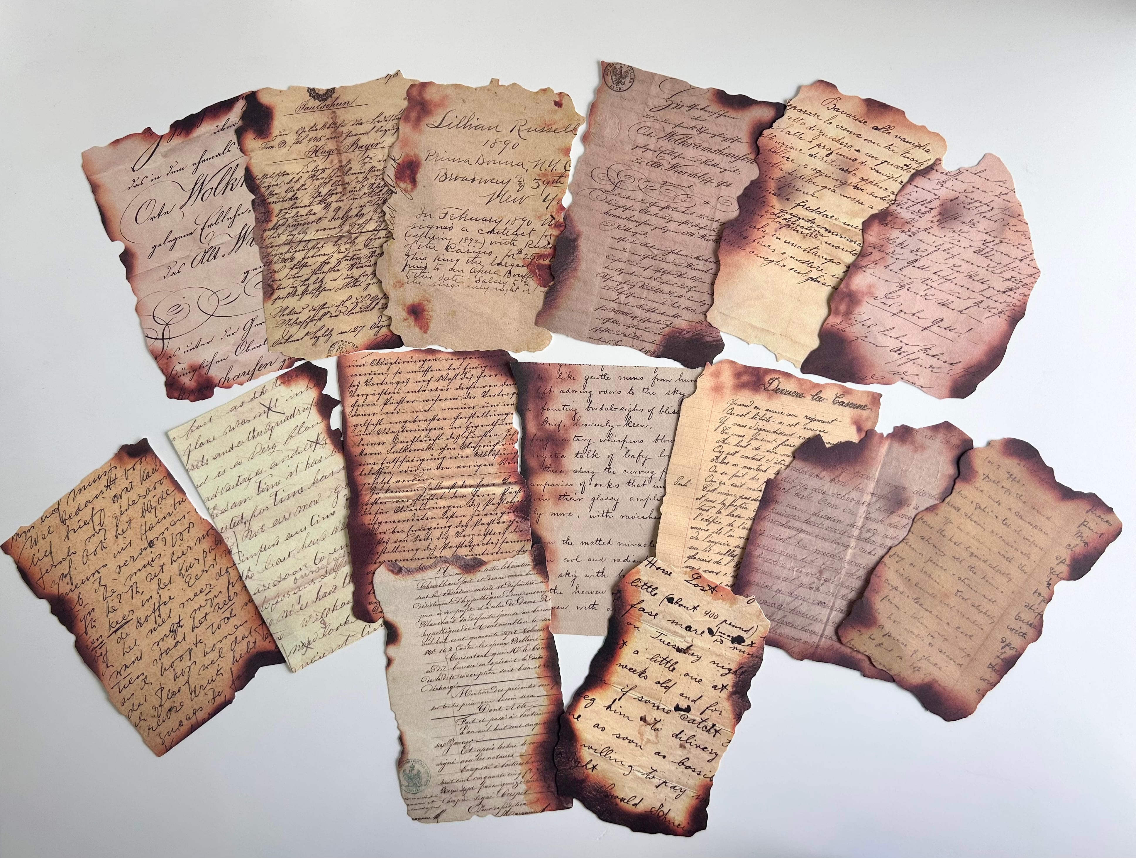 まるでヴィンテージやアンティークの本やお手紙をちぎって焦げさせたようなデザインペーパー。
