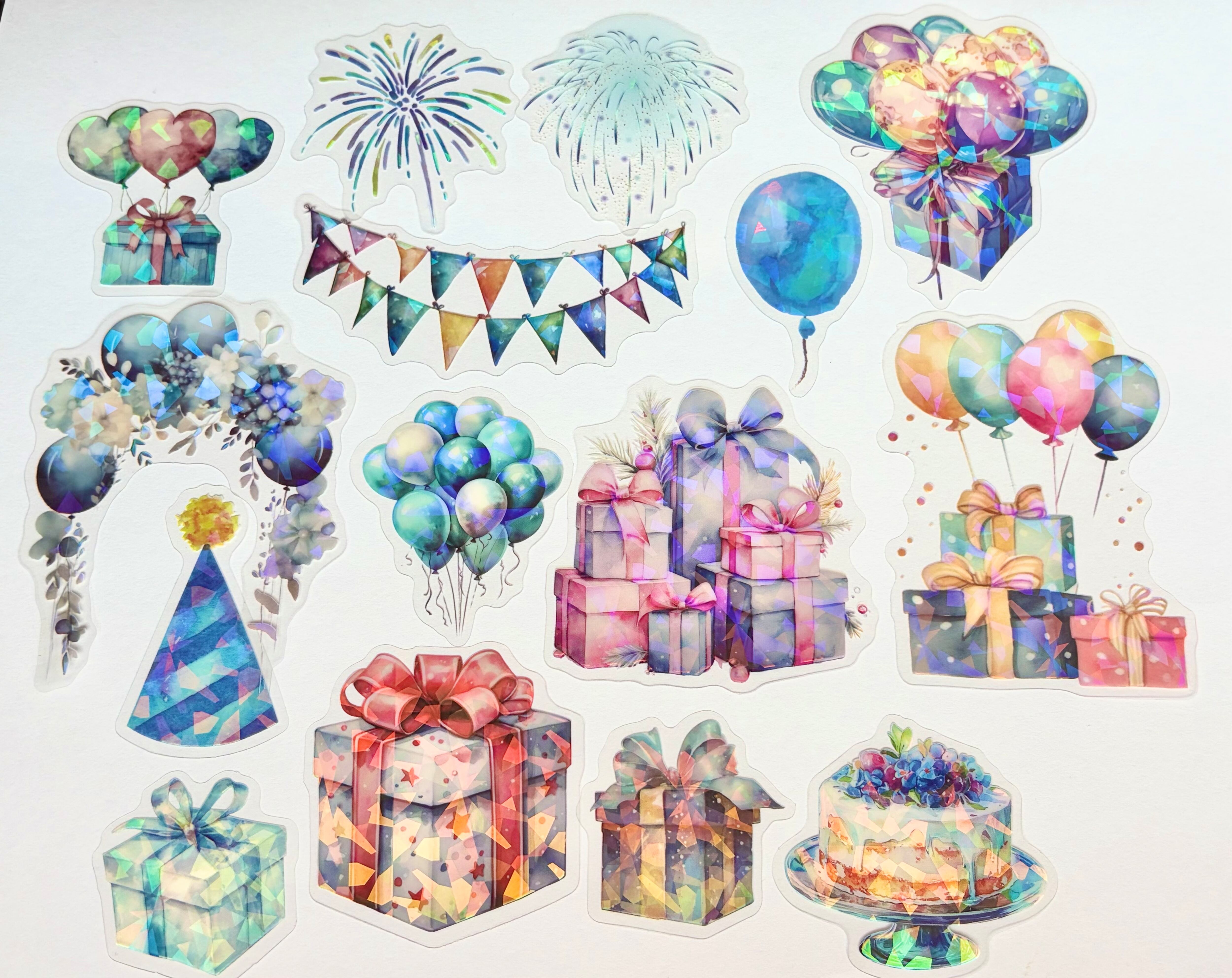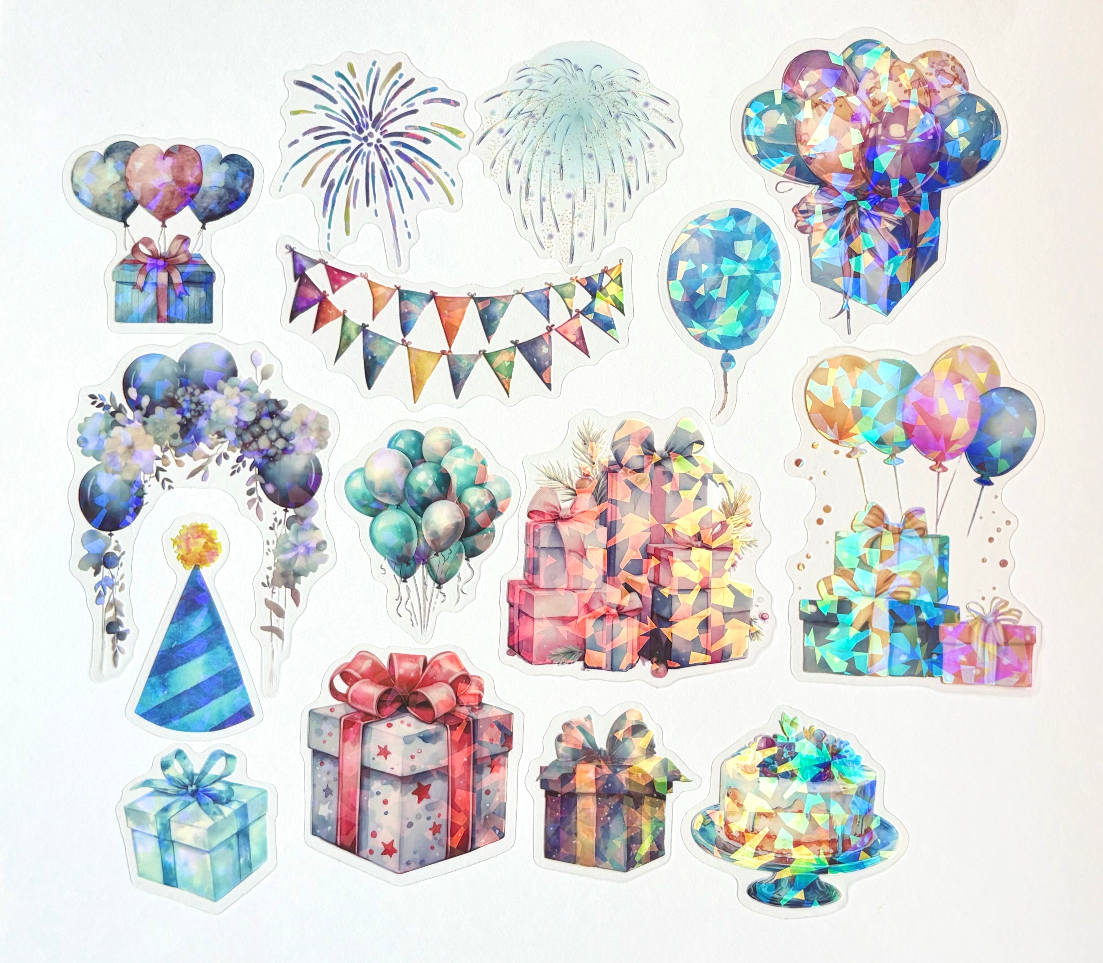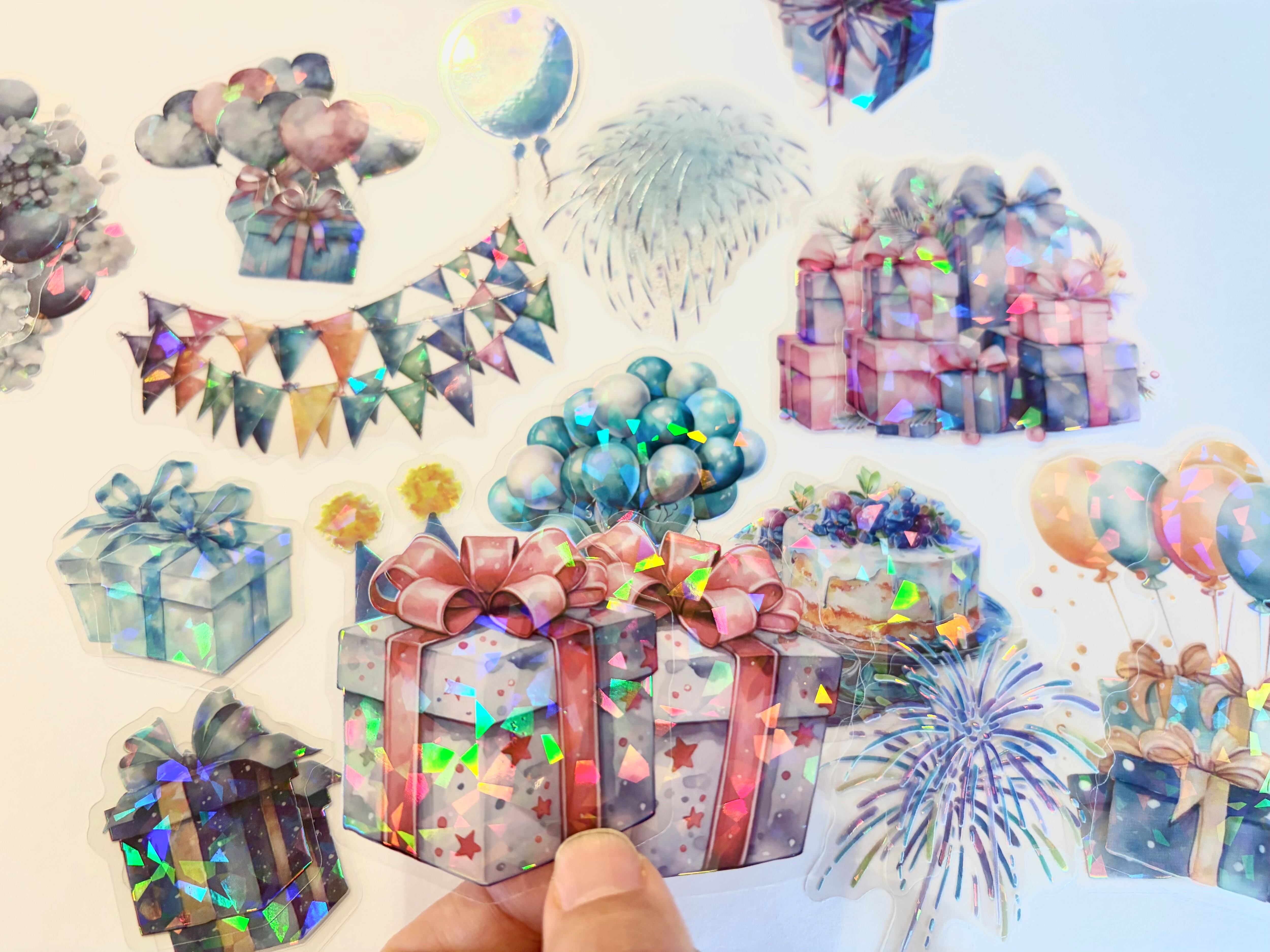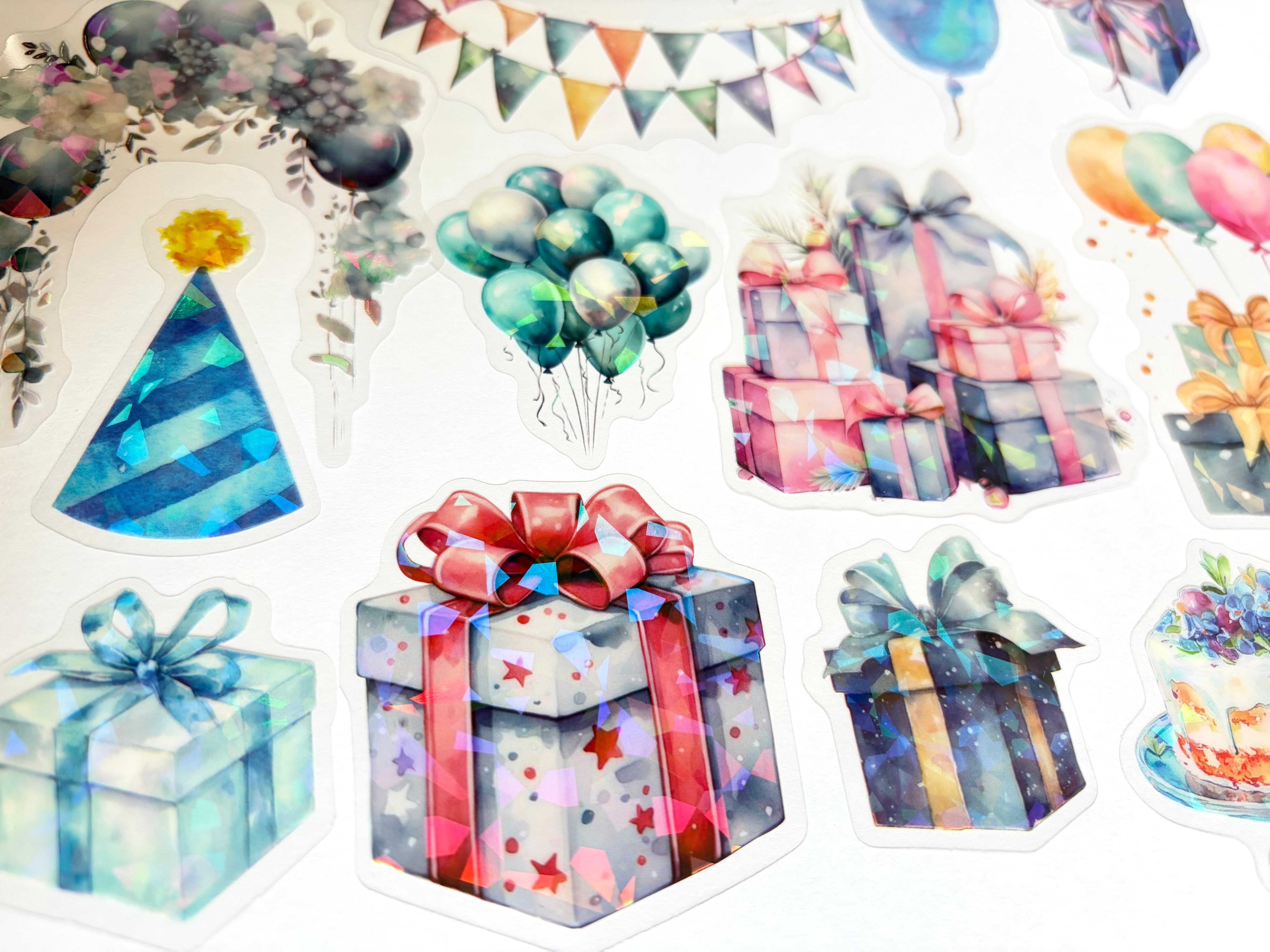 プレゼントやバルーン、ケーキなどのパーティーモチーフ柄で、バースデーカードやお手紙などに貼ってパーティーを盛り上げて。